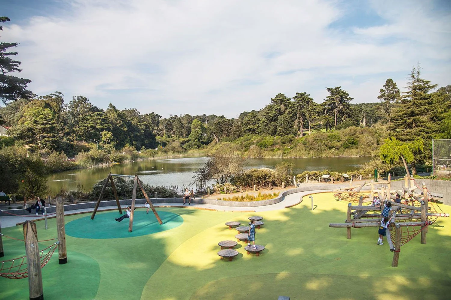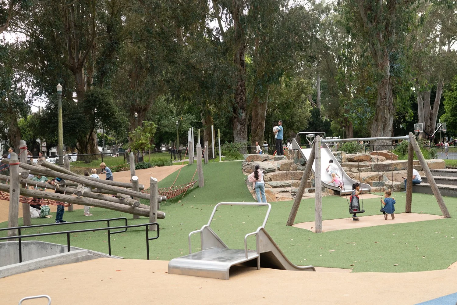Like schoolyards, community playspaces are visited frequently by the same groups of children. This means that the environment must offer a variety of play activities, opportunities for mastery, and areas for discovery so that the children are excited to return—to climb a little higher or try the faster slide. Community playgrounds are also social hubs, where children of different ages can meet and mingle, and where families can come together and relax.
